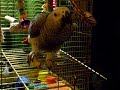 Description: My 8 month old African Grey eating an apple, one of her favorite fruits, and making a mess, one of her favorite things to do! |